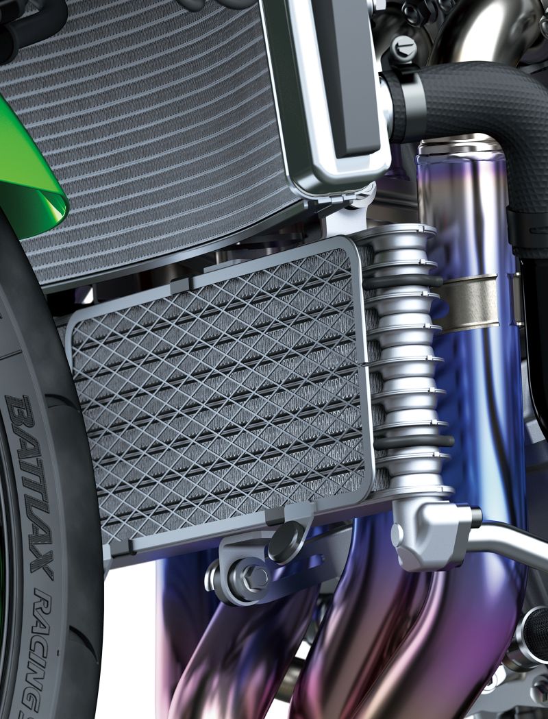 Vzduchem chlazený olejový chladič - na základě zpětné vazby od závodního stroje Kawasaki Ninja ZX-10RR ve WSBK je novým vzduchem chlazeným chladičem oleje s nezávislým oběhem vybavena i standardní ZX-10R - díl, který je často vidět na vysoce výkonných závodních motocyklech.