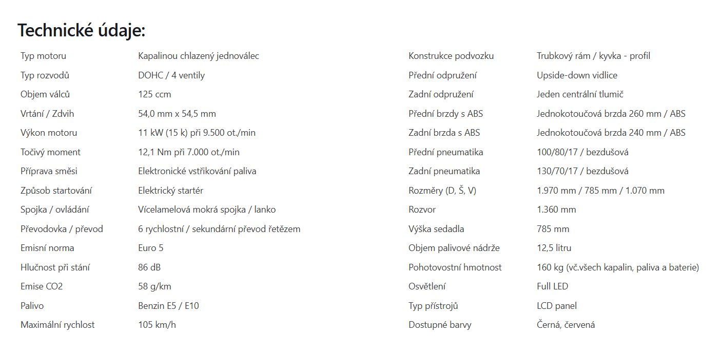 Čtyřtaktní motor o objemu 125 ccm plní emisní normu Euro 5 a poskytuje maximální výkon 11 kW (15 koní). SRK 125 R hbitě akceleruje z každé zatáčky a tak Vám umožní svižnou jízdu ve městě i na okreskách. Jemné elektronické vstřikování zajišťuje přesnou odezvu motoru a nízkou spotřebu paliva.